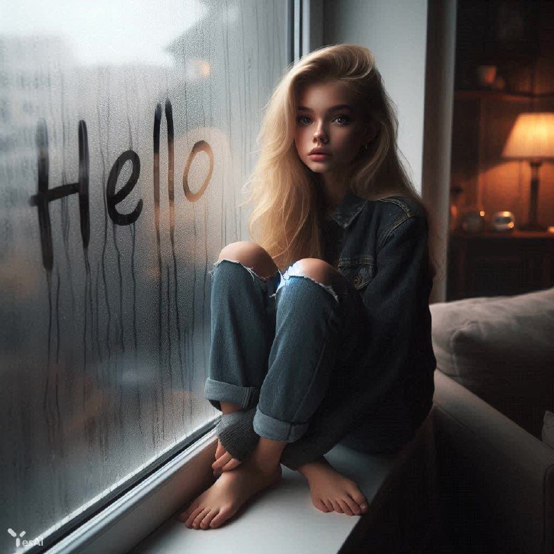✏️ Промт: A seventeen-year-old blonde girl sits on a windowsill in a cozy apartment, modern clothing, sad expression, looking at the viewer. Rain outside, "привет" written with a finger on the foggy glass. The viewer is outside, midground,