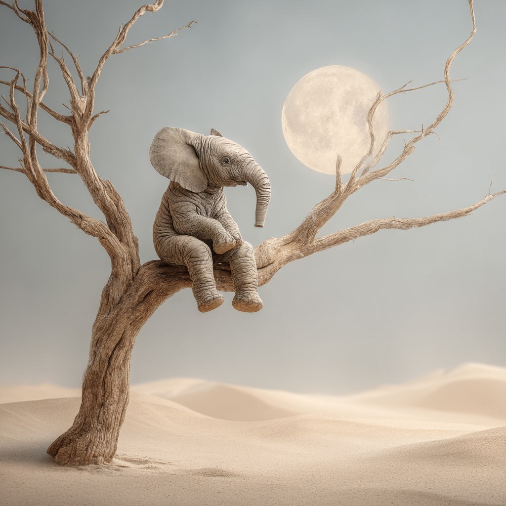 Погрузитесь в завораживающую сюрреалистическую картину: огромный слон, непостижимым образом восседающий вверх ногами на ветке одинокого дерева посреди бескрайней пустыни. Безбрежные дюны из светло-бежечного песка простираются до самого горизонта, контрастируя с бледным светом солнца и небом цвета бледно-серого синего. Сухое дерево, с его серыми стволом и ветвями, добавляет ощущение заброшенности и загадочности пейзажу. Сам слон, изображенный в полный рост, поражает своей мощью и спокойствием. Его серо-коричневая кожа детально проработана, демонстрируя каждую морщинку и складку. Огромные уши слегка приподняты, а массивные ноги уверенно покоятся на ветке. Слон расслабленно сидит, запрокинув голову к почти белому, величественному лунному диску в небе. Широкоугольная съемка захватывает всю панораму пустынного ландшафта, создавая ощущение простора и безграничности. Естественное освещение подчеркивает реалистичность изображения, а общая атмосфера пронизана сном и фантазией. Детализированная композиция, текстуры песка, дерева и кожи слона выполнены с фотореалистичной точностью, погружая зрителя в мир невероятных образов и вызывая чувство удивления перед красотой и загадочностью природы. Это визуальное воплощение мечты, где реальность переплетается с фантазией, создавая поистине уникальный и запоминающийся образ