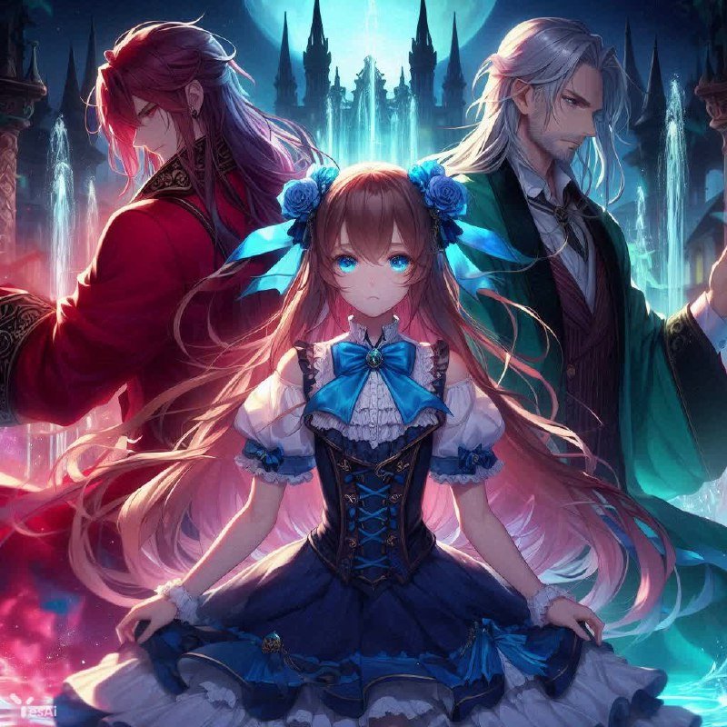 ✏️ Промт: A girl in the center in a Victorian-style school dress with bare shoulders, adorned with bright blue ribbons, looking at the viewer, one long-haired strong guy in a red robe embracing her from behind, another long-haired older guy in a green robe holding her hand, against a magical fountain with glowing water, vibrant blue and red tones, fantasy style, midground,