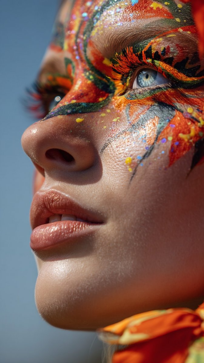 ✏️ Промт: a girl showsesses striking gothic aesthetic with bright orange eyeliner featuring intricate neon green designs and large expressive eyes. colorful splashes burst in the background enhancing their appearance, while a rainbow hue adds a magical touch against clear sky hints at tropical location.