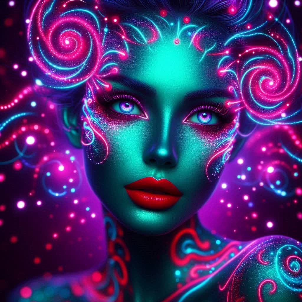 Завораживающий портрет юной девушки, чья кожа сияет ярким бирюзовым оттенком, украшена спиралями светящихся неоновых узоров малинового цвета, изящно окутывающих область вокруг глаз. Ей присуща удивительная красота, подчеркнутая экспрессивным макияжем с насыщенными ало-красными губами, создающими эффектный контраст на фоне лучистого пурпурного фона. Игривое сочетание цветов и оттенков усиливает загадочную атмосферу произведения, погружая зрителя в мир фантазий и мистики. Картина словно дышит энергией и светом, демонстрируя мастерское владение цветом и композицией. В каждом мазке чувствуется стремление передать не только внешнюю красоту модели, но и её внутренний мир, наполненный тайнами и волшебством. Этот портрет – настоящий гимн ярким краскам и нестандартной красоте, способный покорить сердца самых взыскательных ценителей искусства. Он вызывает ощущение лёгкости и свободы, позволяя зрителю окунуться в сказочную реальность, где нет места обыденности. Работа завораживает своей необычностью и оригинальностью, предлагая взглянуть на мир глазами творца, который не боится экспериментировать с цветом и формой. Это произведение – настоящее сокровище для тех, кто ценит красоту в её самых разнообразных проявлениях