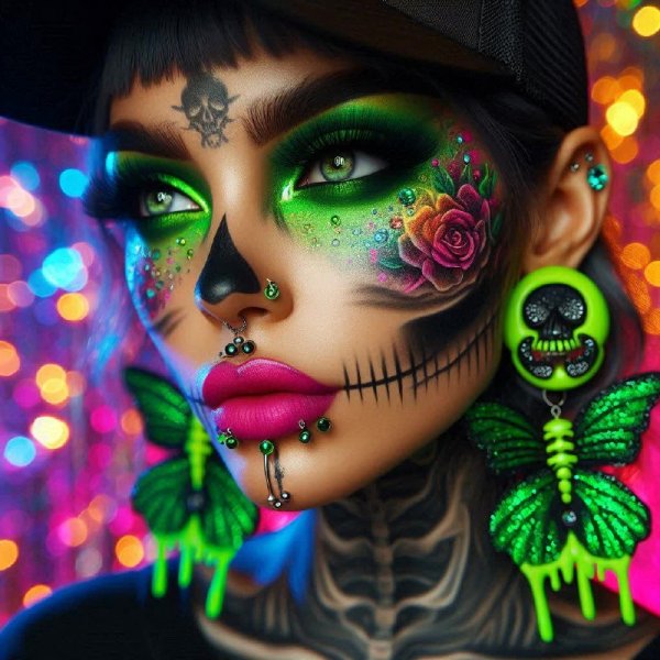 ✏️ Промт: an ogre mage showcases surreal makeup and a dark complexion, her large expressive eyes shine with striking green irice as intricate neon green designs resemble butterfly wings – a headpiece resembling iron golem scales crowns her head while vibrant purple butterflies rest on her cheek; the overall look dynamically blends gothic aesthetics with magical elements like a shadow druid.