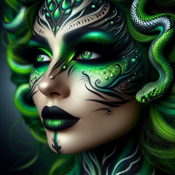 Впечатляющий образ могущественной огр-маги, сотканный из фантастических элементов и готических мотивов. Её кожа намеренно затемнена, создавая эффект таинственности и силы, а огромные выразительные глаза сияют изумрудным светом, притягивая взгляд. На лице выполнен сложный макияж: яркие неоново-зеленые узоры напоминают крылья бабочек, добавляя образу легкости и неземной красоты. Венчает голову изысканный головной убор, имитирующий чешую железного голема – символ мощи и защиты. Нежные фиолетовые бабочки, примостившиеся на щеке, создают контраст с мрачной эстетикой, добавляя нотку хрупкости и волшебства. В целом, образ представляет собой динамичное сочетание готики и магии, отсылающее к образу теневого друида – могущественного защитника природы, владеющего темными искусствами. Это визуальное повествование о силе, красоте и загадочности, воплощенное в уникальном и запоминающемся образе. Магия, готика и фантазия переплетаются в этом захватывающем представлении, создавая ощущение погружения в сказочный мир темных сил и невероятной красоты. Яркий пример мастерства визажиста и его умения создавать поистине незабываемые образы, сочетающие в себе силу, грацию и мистическую привлекательность