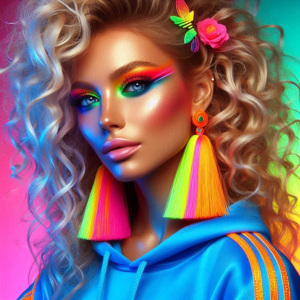 ✏️ Промт: a photo of an attractive blonde woman with big, curly hair, wearing fluorescent neon rainbow makeup and colorful tassel earrings, vivid background creating a dreamy vibe, bold eyeliner, matte skin, adidas inspireed.