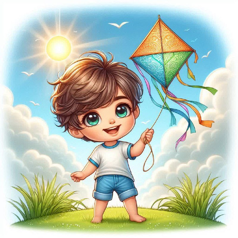 ✏️ Промт: cute cartoon boy with tousled hair, in a striped t-shirt holding a colorful kite, standing on a grassy hill, smiling up at the sky, simple lines, playful atmosphere, bright and cheerful colors, detailed patterns on the kite, background featuring fluffy clouds and a sunny sun.