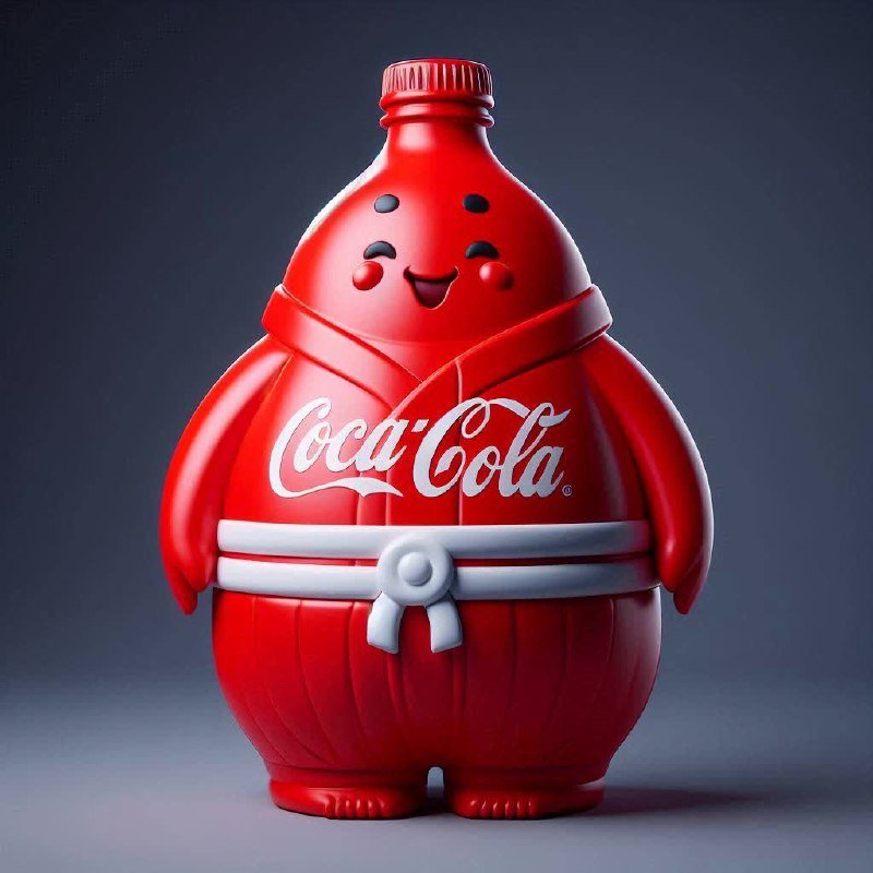✏️ Промт: A stylized, 3D model of a Coca-Cola bottle. The bottle is shaped like a jovial, plump figure in a red kimono, a design reminiscent of a Japanese sumo wrestler. The figure's face is a cheerful, round caricature with large eyes and a gentle smile. The bottle is predominantly bright red, with the Coca-Cola logo in white, appearing on the figure's upper torso, and a stylized white belt (obi) cinching the figure's midsection. The figure is positioned in a three-quarter view, slightly angled to the left of the frame, and is centrally placed. The bottle's pose and the cheerful expression create a playful and celebratory mood. The background is a n...