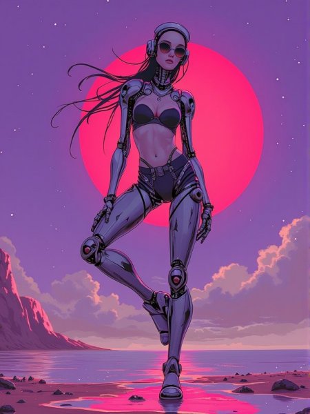 Завораживающий портрет футуристической киборг-женщины в стиле 80-х годов. Идеально проработанный крупный план демонстрирует андроида с серебристой хромированной кожей и выразительной короткой стрижкой, дополненной стильными солнцезащитными очками. Образ выполнен в манере художника Алекса Росса, сочетая детализированную реалистичность и элементы фантастического дизайна. Необычный наряд включает пышное розовое облако ткани, контрастирующее с прочной цепью и изысканной футуристической обувью на высоком каблуке. Японская научная фантастика вдохновляет на создание уникального и запоминающегося образа, подчеркнутого смелым пурпурным фоном. Этот детально проработанный гуманоид излучает силу и элегантность, являясь воплощением моды будущего и передовых технологий. Визуальный акцент сделан на текстурах металла, меха и ткани, создавая ощущение тактильности и роскоши. Эта работа представляет собой захватывающее сочетание эстетики ретро-футуризма и современной цифровой живописи, демонстрируя мастерство художника в создании запоминающихся персонажей и атмосферных сцен. Вся композиция пронизана атмосферой загадочности и технологического прогресса, приглашая зрителя погрузиться в мир будущего, где человек и машина сливаются воедино