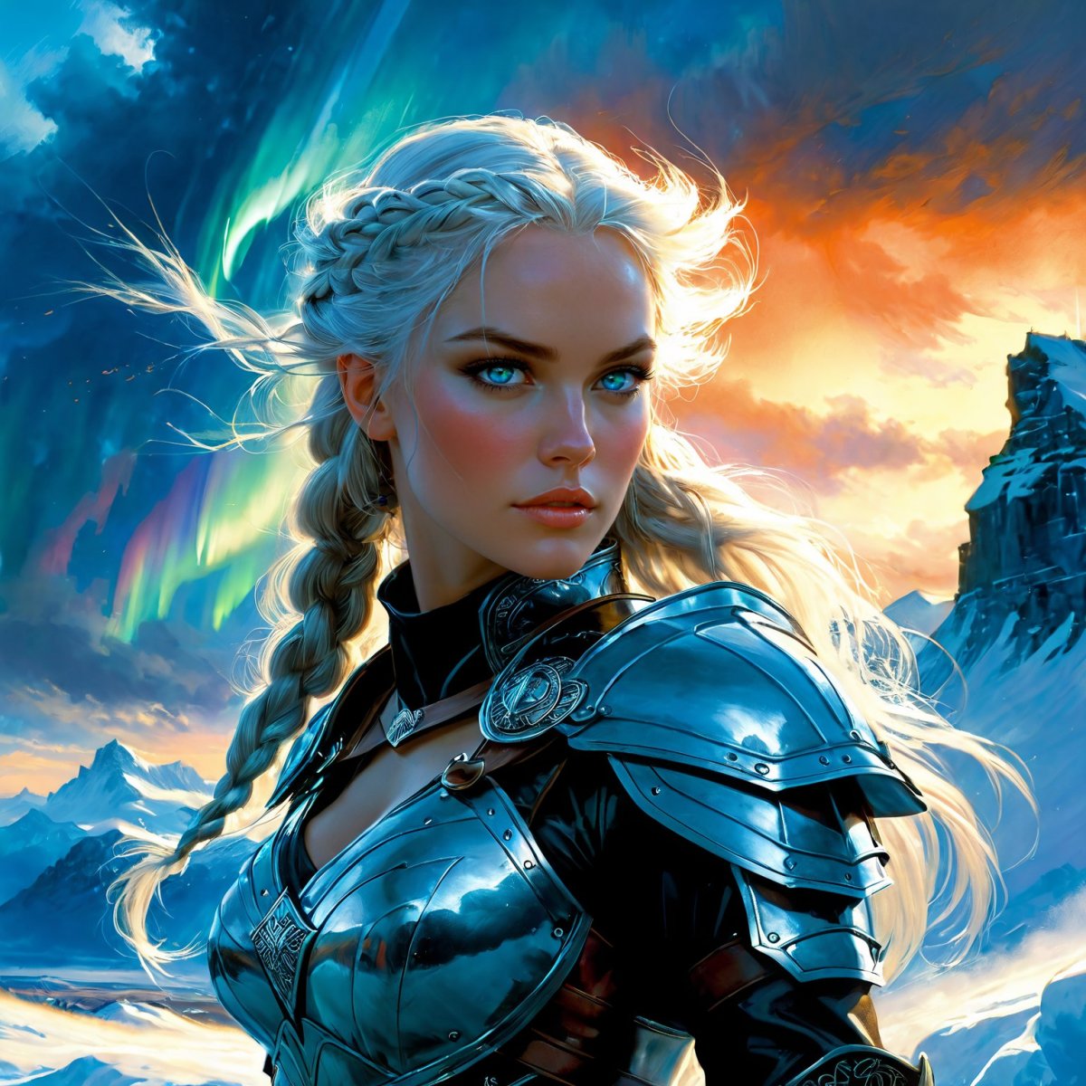 Мощный образ валькирии, запечатленный в динамичной перспективе стремительного полета. Ее бледная кожа контрастирует с ледяными голубыми глазами и платиновыми косами, подчеркивающими ее атлетическое телосложение, облаченное в боевой доспех. За спиной валькирии разворачивается бушующее небо, пронизанное завораживающим сиянием северного света – это создает ощущение мощи и величия происходящего события. Художественная работа выполнена в жанре эпического реализма, вдохновленного стилем известного автора Джона Хау, что придает изображению глубину и достоверность. Детализация поражает воображение: каждая нить косы, каждый элемент доспеха, каждый оттенок неба проработаны с невероятной тщательностью. Картина передает дух яростного сражения и неукротимой силы валькирии, защитницы павших героев. Взгляд ее полон решимости и готовности к любой битве, а поза выражает динамику движения и мощь удара. Это не просто изображение – это воплощение мифа о воительницах, спускающихся с небес, чтобы определить судьбу смертных. Работа выполнена в высоком разрешении 16 тысяч пикселей, что позволяет рассмотреть мельчайшие детали и полностью погрузиться в атмосферу эпического противостояния. Зритель чувствует себя очевидцем грандиозного события, свидетелем битвы между добром и злом