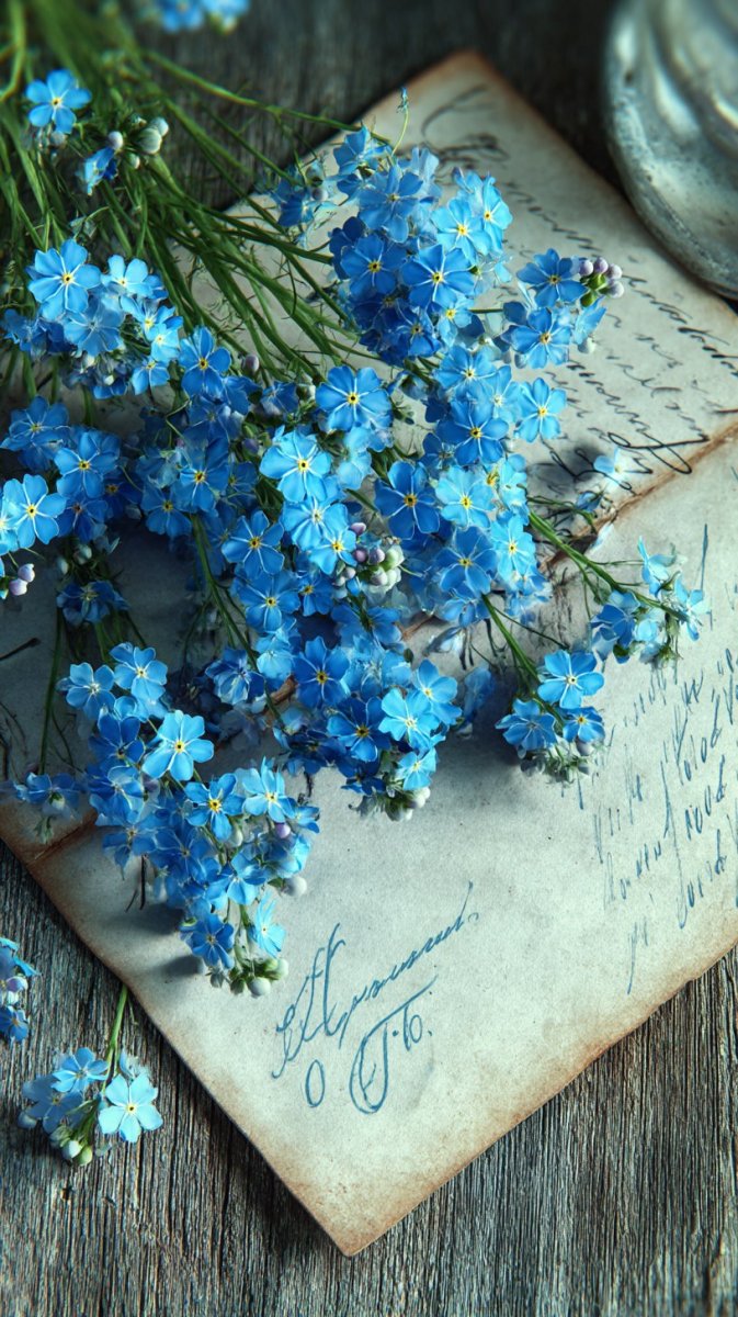 Открытый конверт с пышным букетом маленьких, ярких синих цветов незабудки внутри лежит на частично видимом письме с рукописным текстом.