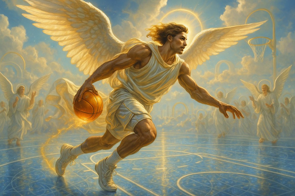 Небесный ангел: захватывающий баскетбольный матч в сияющем мире грёз и величия - Пример изображения, сгенерированного нейросетью Sora images Ai