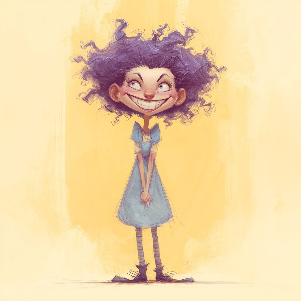 a playful character with curly purple hair and a wide grin, dressed in a pastel blue dress and mismatched socks, set against a soft yellow background, exhibiting hypertrophied facial features and a carefree vibe, merging grotesque and primitive styles.