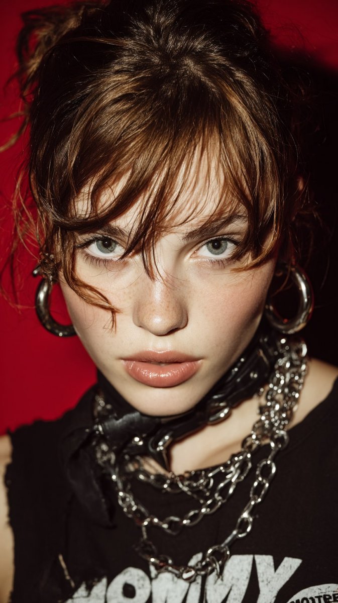 A Fashion Girl Radiating Confidence Against a Bright Solid Background, Shot with a Nikon Z6 and 50mm Lens, Her Intense Gaze Fixed on the Viewer, Forming a Captivating Connection. She Embodies Punk Style with Edgy Leather Accents, a Graphic Tee, and Distressed Denim, Elevated by Bold Accessories That Make a Statement. Her Hair is Styled in Wild Waves, Framing Her Face, and Contrasting with the Clean Lines of Her Outfit. The Lighting is Bright and Playful, Casting Dynamic Shadows That Add Depth to the Scene, While the Overall Composition Showcases the Brash Yet Artistic Nature of Streetwear Culture, Merging Creativity with Bold Individualism. -...