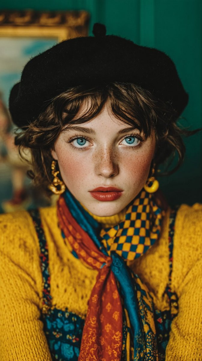 Очаровательная модница в винтажном образе смотрит прямо на зрителя, излучая уверенность и элегантность. Яркий однотонный фон акцентирует внимание на деталях ее роскошного наряда, сочетающего насыщенные цвета и изящные кружевные узоры, словно перенося нас в эпоху былого величия. Мягкое золотое освещение подчеркивает выразительность лица модели, добавляя снимку нотку ностальгии и романтики. Фотография выполнена с использованием профессионального оборудования – Canon EOS R5 и объектива 50mm f/1.2 – что обеспечивает исключительную четкость и глубину изображения, передавая мельчайшие нюансы текстур ткани и игру света на коже. Вся композиция пронизана атмосферой гламура и утонченности, создавая впечатление захватывающего момента, запечатленного во времени. Это не просто фотография – это визуальный рассказ о красоте, стиле и вдохновении, воплощенный в безупречном художественном исполнении. Стиль raw придает снимку естественности и живости, подчеркивая реалистичность и правдивость изображения. Каждый элемент композиции тщательно продуман, чтобы создать гармоничный и запоминающийся образ