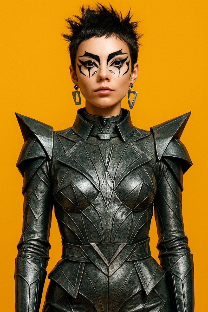 An Avant-Garde Girl stands confidently, looking directly at the Viewer, sporting a futuristic outfit with metallic textures and sharp angular designs. Captured with a Nikon Z7 II and a 35mm lens, the Bright Solid Background amplifies her bold statement. Her striking makeup features geometric patterns that match her attire, while innovative accessories blend art and fashion seamlessly. The composition highlights her individuality, igniting curiosity and admiration for her daring style.