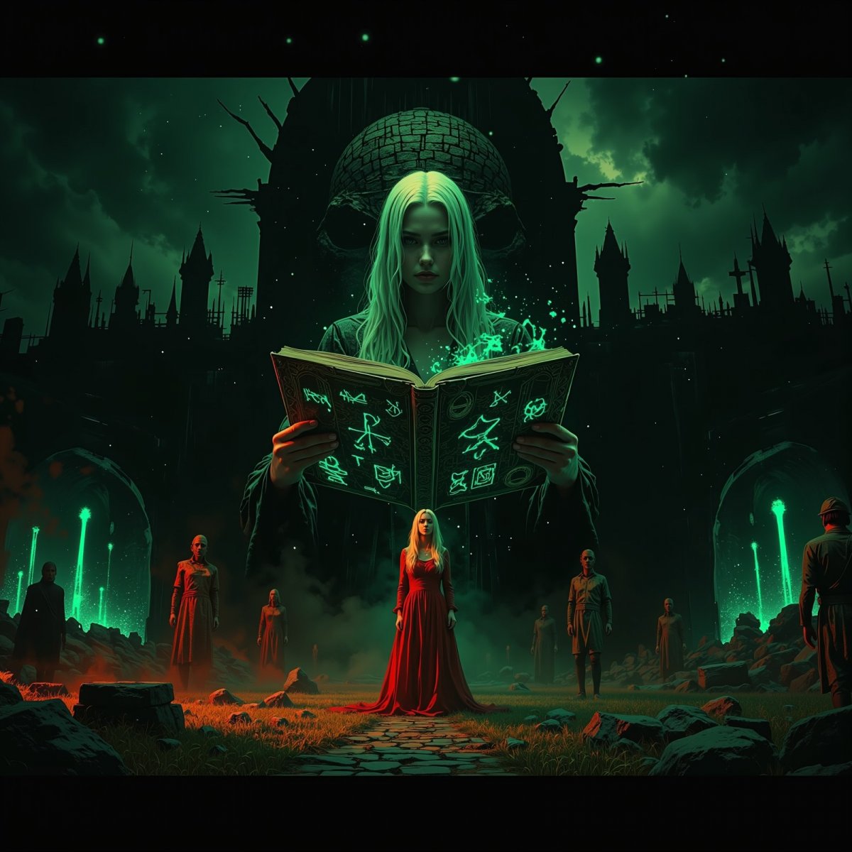Завораживающая и мрачная картина в формате 8K, пронизанная атмосферой тайны и отчаяния, словно сошедшая со страниц древней легенды. В центре композиции – женщина с длинными белыми волосами, облаченная в алое платье, ее лицо отражает решимость и страх перед надвигающейся угрозой. Она держит открытую книгу, из которой вырываются зловещие светящиеся символы, словно портал в иной мир. Вокруг нее клубится хаос: искаженные образы безумия, щупальца, тянущиеся из темноты и призрачные фигуры, наблюдающие за ней из теней. На заднем плане – руины некогда величественных городов, где царят неземные силы, а звезды выстроились в ряд предвещая грозу. Мрачный свет подчеркивает неизбежность ужаса и безумия, играя на контрастах света и тени, создавая ощущение глубины и напряжения. Вдали виднеются призрачные силуэты погибших атлантов и таинственные руны, вырезанные на стенах, добавляя картине мистического колорита и намекая на древнюю трагедию. Эта визуализация – воплощение песни 'Call from the depths of the times', передающая ее гнетущую атмосферу и мрачные темы с поразительной реалистичностью и детализацией, погружая зрителя в мир кошмаров и вечной тоски по ушедшей эпохе. Атмосфера безысходности пронизывает каждый пиксель изображения, словно предостерегая о грядущем апокалипсисе