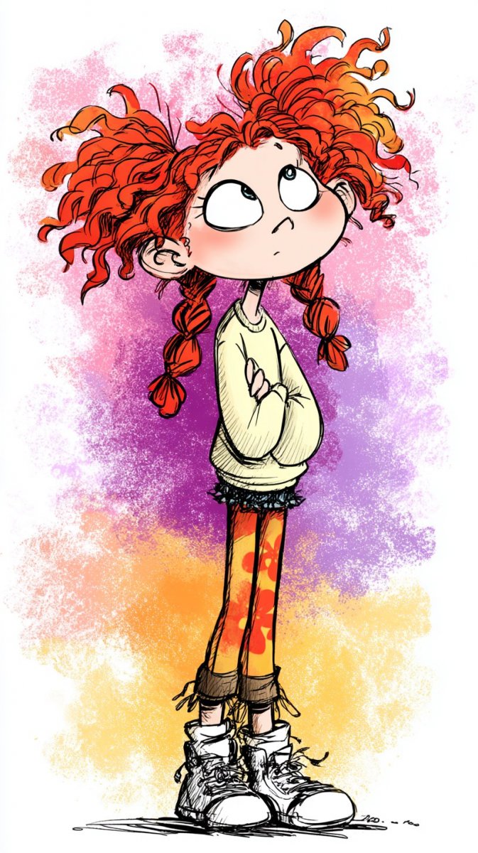 lively cartoon character has curly red hair braided in pigtails dressed in a light long-sleeved shirt exhibiting whimsical styles on a colorful blend of purple, pink, orange and yellow.