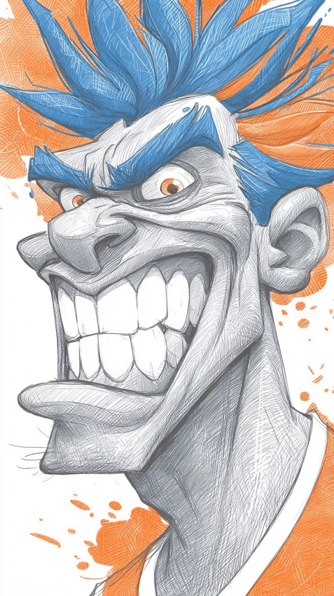 Этот персонаж мультфильма предстает перед нами в гротескном стиле карикатуры – его лицо искажено нарочитой ухмылкой, демонстрирующей острые как бритва зубы. Беспорядочная масса синих и белых волос добавляет образу эксцентричности и некоторой безумности. Выражение лица персонажа одновременно пугает и завораживает, создавая ощущение непредсказуемости и скрытой силы. Простое однотонное оформление фона позволяет полностью сосредоточиться на деталях самого героя, подчеркивая его необычную внешность и передавая атмосферу тревожности или даже комического ужаса. Художник намеренно использует преувеличенные черты лица и деформированные пропорции, чтобы создать яркий запоминающийся образ, который вызывает смешанные чувства – от легкой улыбки до непроизвольной дрожи. Кажется, будто этот персонаж вышел прямо из кошмарного сна или сказочного мира, где действуют свои собственные странные правила. Его гротескная внешность заставляет задуматься о природе красоты и уродства, о границах нормы и отклонения. Это не просто рисунок – это визуальная метафора, отражающая внутренний мир персонажа или же высмеивающая общепринятые стандарты. Изображение вызывает бурю эмоций и заставляет зрителя внимательно рассмотреть каждую деталь этого причудливого создания. В целом, работа производит сильное впечатление благодаря своей оригинальности и мастерскому исполнению в выбранном стиле