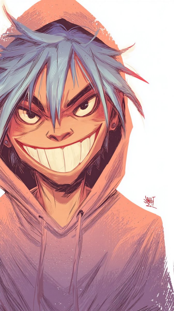 Яркий персонаж мультфильма демонстрирует преувеличенную ухмылку с острыми зубами и взъерошенными голубыми волосами на фоне однотонного фона. На нем надета легкая фиолетовая толстовка, а его лицо отличается гипертрофированными чертами. Создается впечатление нарочитой гротескности и некоторой безумности в выражении лица персонажа, что может указывать на его комичный или даже злодейский характер. Контраст между яркими цветами волос и одежды и простым фоном акцентирует внимание на деталях внешности героя, делая его образ запоминающимся и эксцентричным. Кажется, будто перед нами типичный представитель мира мультфильмов с подчеркнуто выраженными чертами лица, призванными усилить комический эффект или передать определенные характерологические особенности. Использование преувеличенных пропорций создает ощущение нереальности и фантастичности, характерное для анимационных персонажей. В целом, изображение производит впечатление динамичного и энергичного героя, готового к приключениям или продемонстрировать свою эксцентричную натуру. Его образ может быть использован в различных проектах, от детских мультфильмов до юмористических комиксов, благодаря своей выразительности и запоминающемуся дизайну