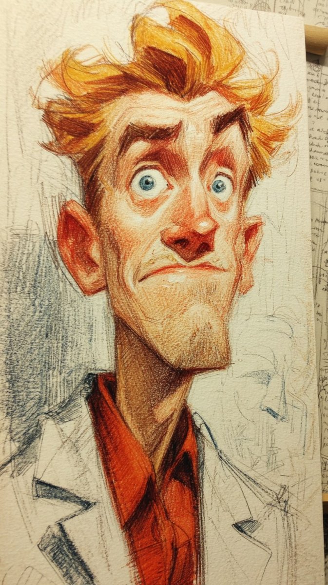 Яркий персонаж с длинными растрепанными светлыми волосами и большим носом предстает в белой рубашке на пуговицах, выражая удивление на фоне бежевого фона. Его преувеличенные черты лица подчеркнуты в гротескном стиле карикатуры, создавая запоминающийся образ. Вся композиция пронизана игривыми выражениями и необычными прическами, что добавляет персонажу уникальности и шарма. Картина выполнена в технике raw, придающей ей особую живость и динамику. Художник мастерски передал эмоции и настроение, используя смелые штрихи и яркие цвета. Этот образ – не просто портрет, а целая история, рассказанная посредством выразительных деталей и неожиданных решений. Он привлекает внимание своей эксцентричностью и вызывает улыбку благодаря гротескному преувеличению черт лица. Вся работа выполнена с большим вниманием к деталям, что позволяет зрителю полностью погрузиться в мир персонажа и почувствовать его эмоции. Стиль raw добавляет изображению особую текстуру и глубину, делая его еще более привлекательным и запоминающимся. Это произведение искусства – яркий пример сочетания юмора и мастерства исполнения