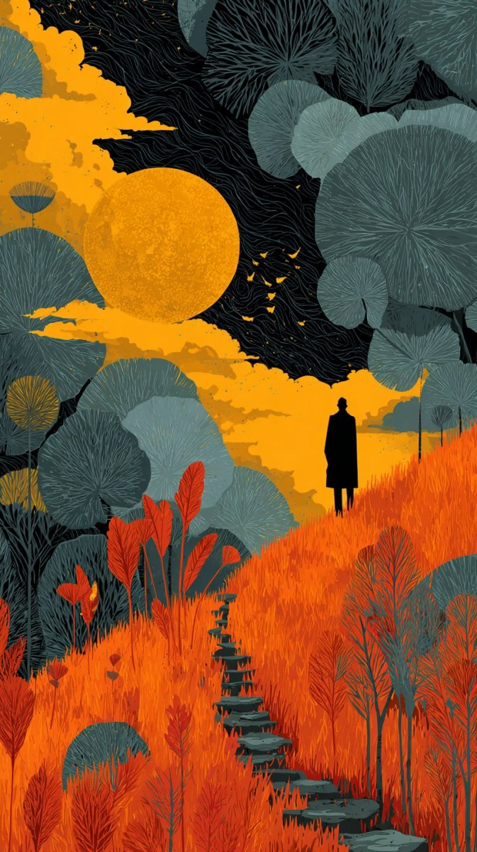 Завораживающая цифровая картина, пронизанная атмосферой умиротворения и глубоких эмоций. Одинокая фигура возвышается на холме, купаясь в лучах закатного солнца, которое окрашивает мир в теплые золотые тона. Вокруг простирается фантастический сад, сотканный из графических иллюстраций абстрактных растений – причудливых форм и ярких красок, создающих ощущение волшебства и нереальности. Художник мастерски сочетает современные цифровые медиа с традиционными техниками живописи, достигая гармонии между новаторством и классикой. Выразительные линии подчеркивают динамику композиции и придают изображению особую глубину. Картина словно приглашает зрителя погрузиться в мир тишины и созерцания, почувствовать единение с природой и ощутить всю красоту момента. Это произведение искусства – не просто изображение, а эмоциональный портрет состояния души, запечатленный на цифровом холсте, вызывающий чувство покоя и вдохновения. Контраст между одинокой фигурой и буйством растительности создает ощущение внутренней силы и стойкости перед лицом неизбежного течения времени. Свет и тень играют ключевую роль в создании настроения картины, подчеркивая драматизм сцены и усиливая ее визуальное воздействие на зрителя. Каждый элемент композиции тщательно продуман и выверен, чтобы создать целостное и гармоничное произведение искусства, способное тронуть самые тонкие струны души