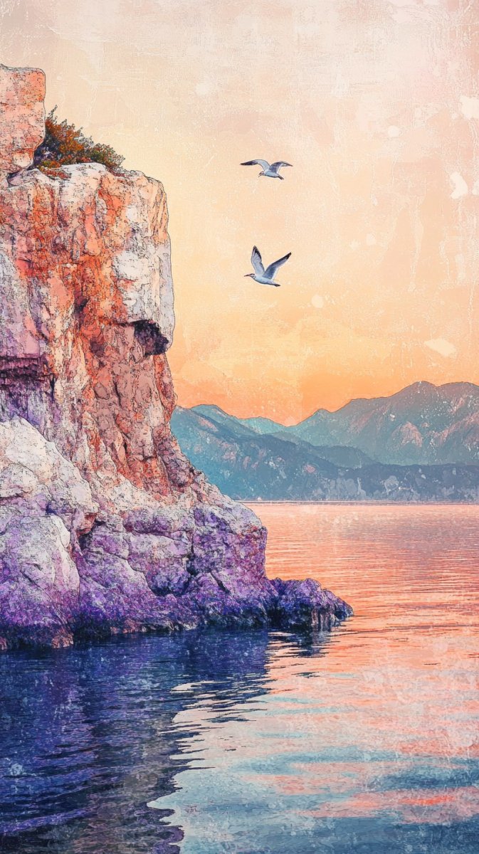 Завораживающий пейзаж озера Байкал на рассвете – это панорамная картина величия и спокойствия. Скалистый берег, устремленный к небу, служит домом для крикливых чаек, парящих над водной гладью и отдыхающих на каменных выступах. Мягкое золотое солнце едва касается поверхности воды, окутывая ее легкой дымкой и создавая нежную градиентную палитру от лавандового до бледно-оранжевого в небе. Атмосфера царит умиротворяющая и безмятежная, наполняя сердце тихой радостью. Вдали виднеются силуэты гор, словно рожденные из утреннего тумана, добавляя глубины и масштаба этому потрясающему зрелищу. Спокойная поверхность озера отражает небесные оттенки, создавая ощущение бесконечности и гармонии с природой. Изображение вдохновлено работами Анселя Адамса, известного своим мастерством в запечатлении красоты дикой природы, и выполнено на камеру Nikon D850 с применением мягкой HDR-обработки для подчеркивания текстур и деталей, придавая снимку особую глубину и реалистичность. Это произведение искусства дарит зрителю возможность почувствовать себя частью этого величественного момента, погрузившись в мир спокойствия и красоты первозданной природы. Каждое мгновение рассвета запечатлено с любовью к деталям и глубоким пониманием тонкостей света и тени