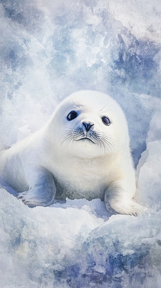 Нежная акварельная картина изображает пушистого белого детеныша тюленя, спокойно лежащего на заснеженной ледяной поверхности озера Байкал. Зима окутывает пейзаж, вдалеке виднеются величественные снежные горы, а кристально чистый лед искрится под мягким дневным светом. Пастельные тона создают атмосферу умиротворения и безмятежности, отражаясь в тонких бликах на поверхности льда. Художник мастерски передал детализированные акварельные текстуры, используя технику, вдохновленную работами Жан Эйнс, с характерными мазками кисти и выразительным рисунком. Цифровая постобработка добавила нежности, имитируя эффект деликатной акварельной бумаги, усиливая ощущение легкости и воздушности изображения. Картина завораживает своей красотой и спокойствием, приглашая зрителя окунуться в мир зимней сказки на берегах легендарного озера Байкал, где царит гармония природы и безмятежность дикой жизни. Это произведение искусства – ода красоте зимы и хрупкости мира животных, воплощенная в изящных акварельных красках