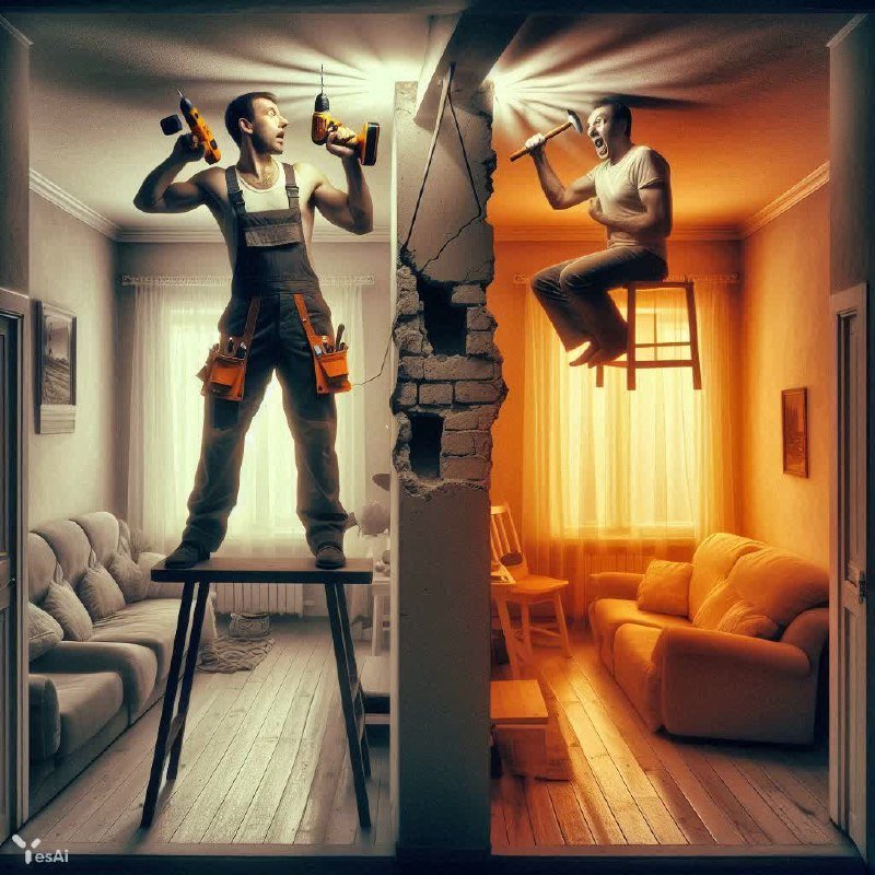 Двойная экспозиция: две квартиры, соседи сверху и снизу. Сосед сверху сверлит дрелью свою стену, с засученными рукавами и трениками, весь в испарине. Сосед снизу встал на табуретку и с возмущением стучит молотком ему по потолку. В меру уютные обстановки комнат в квартирах, приглушенный свет, теплые цвета без резких контрастов, с яркими аецентами. Ломографический эффект. Реалистично, но с юмором.