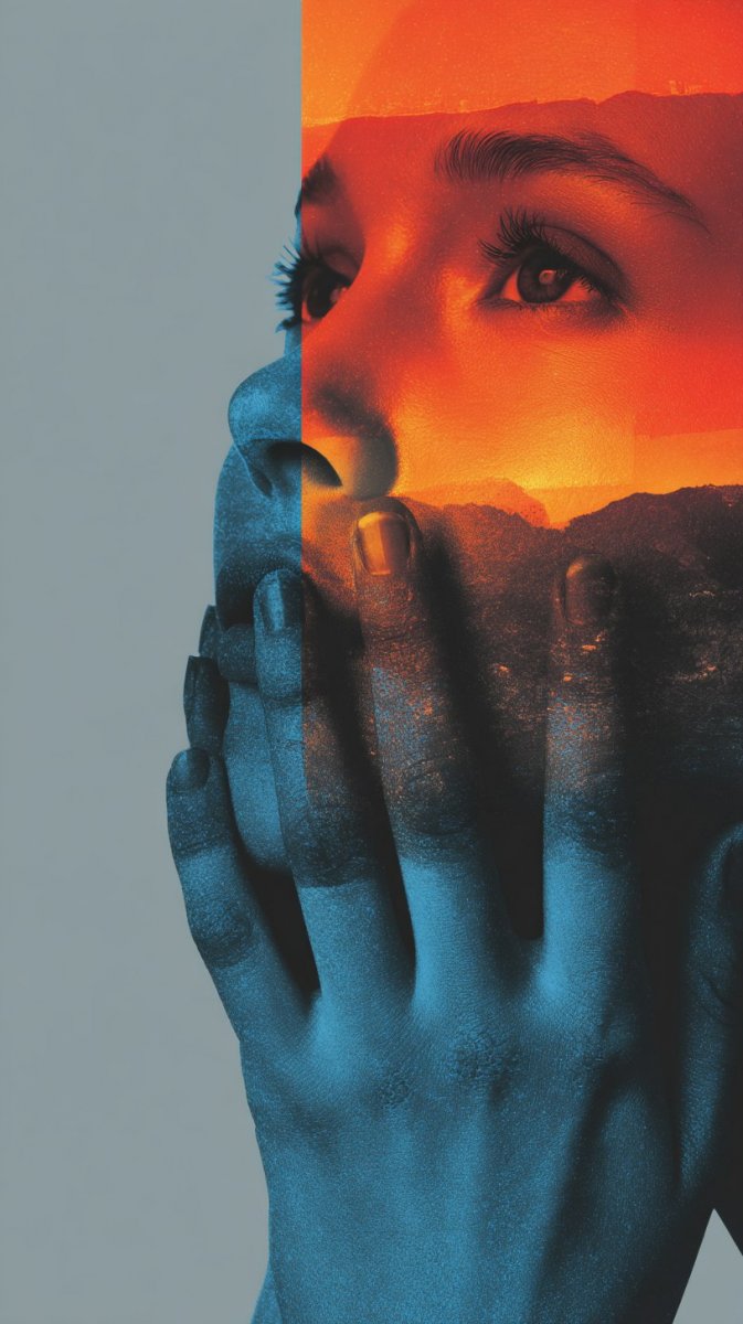 a woman’s face is reflected on her palm with two fingers, dreamy atmosphere, high resolution photography, artistic collage, black and white color palette, split portrait of two smiling young women, minimalist movie poster, impasto texture, ethereal landscape, double exposure glitch effect, isolateed on a blue-grey solid color background.