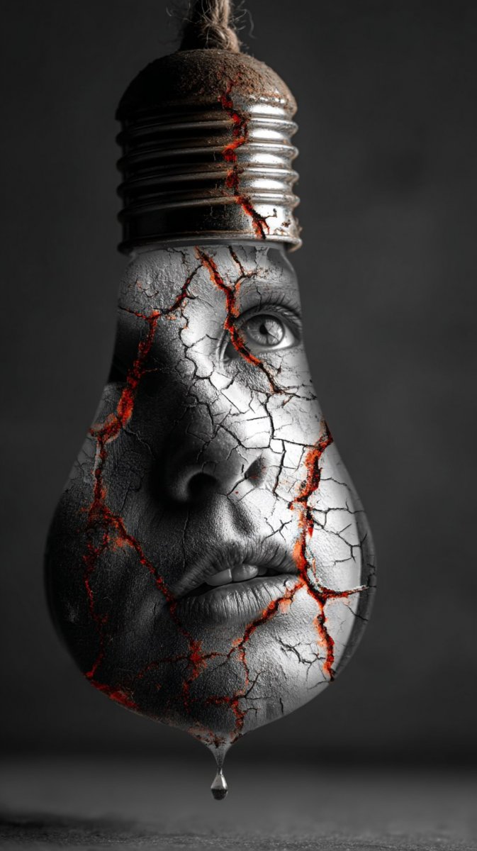 Хрупкость человеческого существования и стремление к свету в мире контрастов воплощены в этом завораживающем черно-белом портрете. Лицо, потрескавшееся словно пересохшая земля, служит метафорой уязвимости и бренности, а капля воды, запечатленная рядом с лампочкой, – символом жизненной силы, надежды и возможности обновления. Тонкая игра света и тени, созданная студийным освещением, подчеркивает драматизм композиции и добавляет ей глубины. Использование техники импасто придает изображению богатую текстуру, словно оживляя трещины на коже и делая их ощутимыми. Бесшовный переход лица к яркому свету создает ощущение вознесения, духовного подъема, преодоления препятствий и поиска истины. Это не просто портрет, а скорее художественная коллаж, в котором реальность переплетается с сюрреализмом, создавая мощное визуальное высказывание о человеческой душе и ее неутолимой жажде света. Абстрактный фон лишь усиливает эффект погружения в мир грез и размышлений, оставляя зрителю пространство для интерпретации и личных ассоциаций. Каждое движение кисти, каждый оттенок серого передает глубокий эмоциональный заряд и приглашает задуматься о вечных вопросах бытия. Это работа, которая одновременно пугает своей реалистичностью и восхищает своей красотой