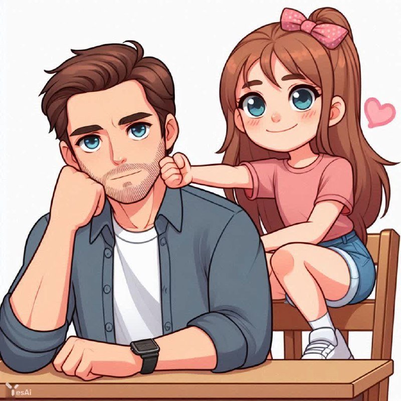 Милая и трогательная иллюстрация в ярком мультяшном стиле демонстрирует нежный момент между мужчиной и девушкой. Мужчина сидит за столом, пристально глядя прямо в камеру, словно приглашая зрителя стать свидетелем этой сцены. Рядом с ним, на самом столе, расположилась девушка, её фигура обращена к зрителю спиной, но её рука нежно поддерживает мужчину за щеку. В этом простом жесте кроется глубина чувств и близости: забота, поддержка или, может быть, игривое поддразнивание. Яркие цвета и округлые формы создают атмосферу легкости и беззаботности, характерную для 2D-мультфильмов. Изображение передает ощущение тепла, уюта и искренней привязанности между двумя людьми, заставляя зрителя улыбнуться и почувствовать себя частью этого трогательного момента. Композиция картины выстроена таким образом, чтобы подчеркнуть взаимодействие героев и создать визуальный интерес, привлекая внимание к деталям – выражению лица мужчины, позе девушки и контрасту между их расположением: он на полу, она – на столе. Этот рисунок станет прекрасным украшением для детской комнаты, обложки книги или просто способом добавить немного позитива в повседневную жизнь. Он излучает оптимизм и напоминает о важности человеческих связей и моментов искренней радости