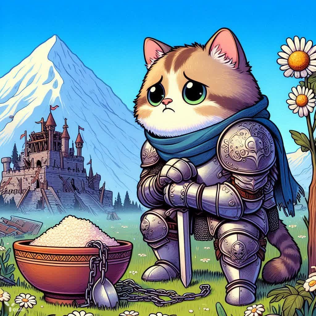 Забавное сочетание нежности и героизма! Этот очаровательный котик, словно маленький рыцарь, погружен в задумчивый процесс гадания на ромашке. Его трогательная грусть контрастирует с блеском средневековых доспехов, создавая поистине уникальный образ. Миска с кашей намекает на скромные потребности даже самого отважного воина, а цепочка из канцелярских скрепок добавляет немного юмора и повседневности в эту фантастическую сцену. На заднем плане возвышается величественная гора Эверест, словно символ непреодолимых препятствий, а рядом – руины рыцарского замка, хранящие память о былой славе и приключениях. Картина полна символизма: сочетание милой кошачьей мордочки с воинственным антуражем вызывает улыбку и заставляет задуматься о хрупкости мира, о смелости перед лицом трудностей и о важности маленьких радостей в жизни. Это трогательный рассказ, рассказанный языком визуального искусства, где юмор переплетается с меланхолией, а сказка – с реальностью. Неужели этот рыцарь-котик предсказывает будущее или просто мечтает о приключениях и вкусной каше? Погрузитесь в эту волшебную атмосферу и откройте для себя историю этого необычного героя, который сочетает в себе мягкость котенка и отвагу настоящего воина