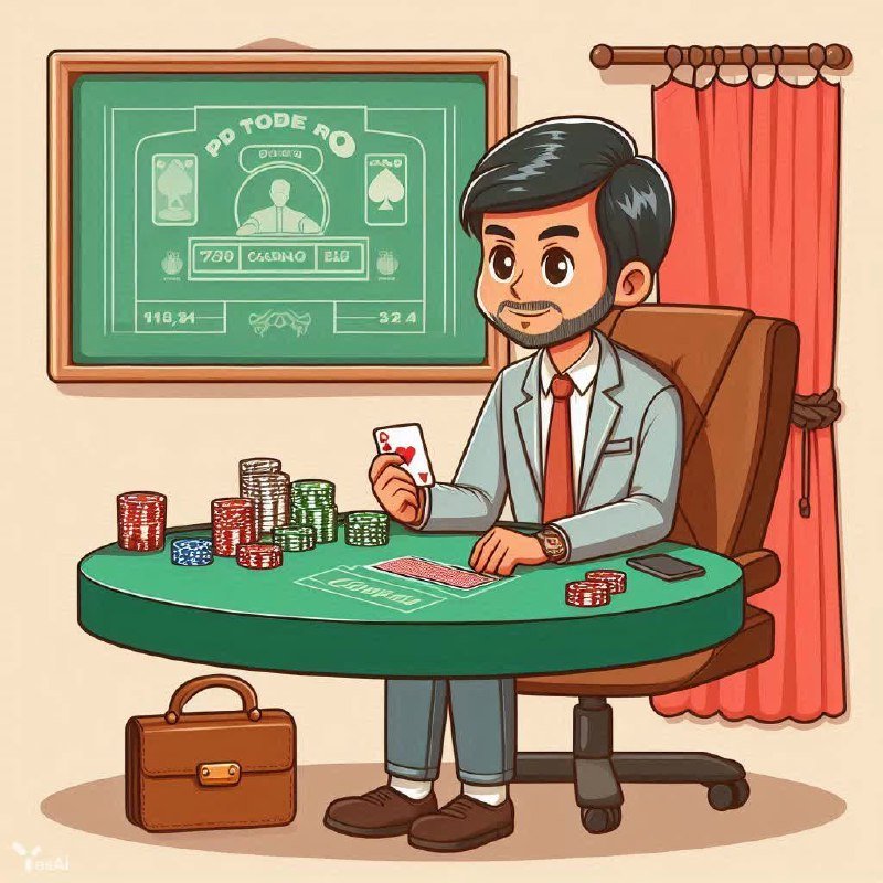 Cartoon simple 2d style, a man is sitting at a table and playing poker, the man himself is sitting in a casino room