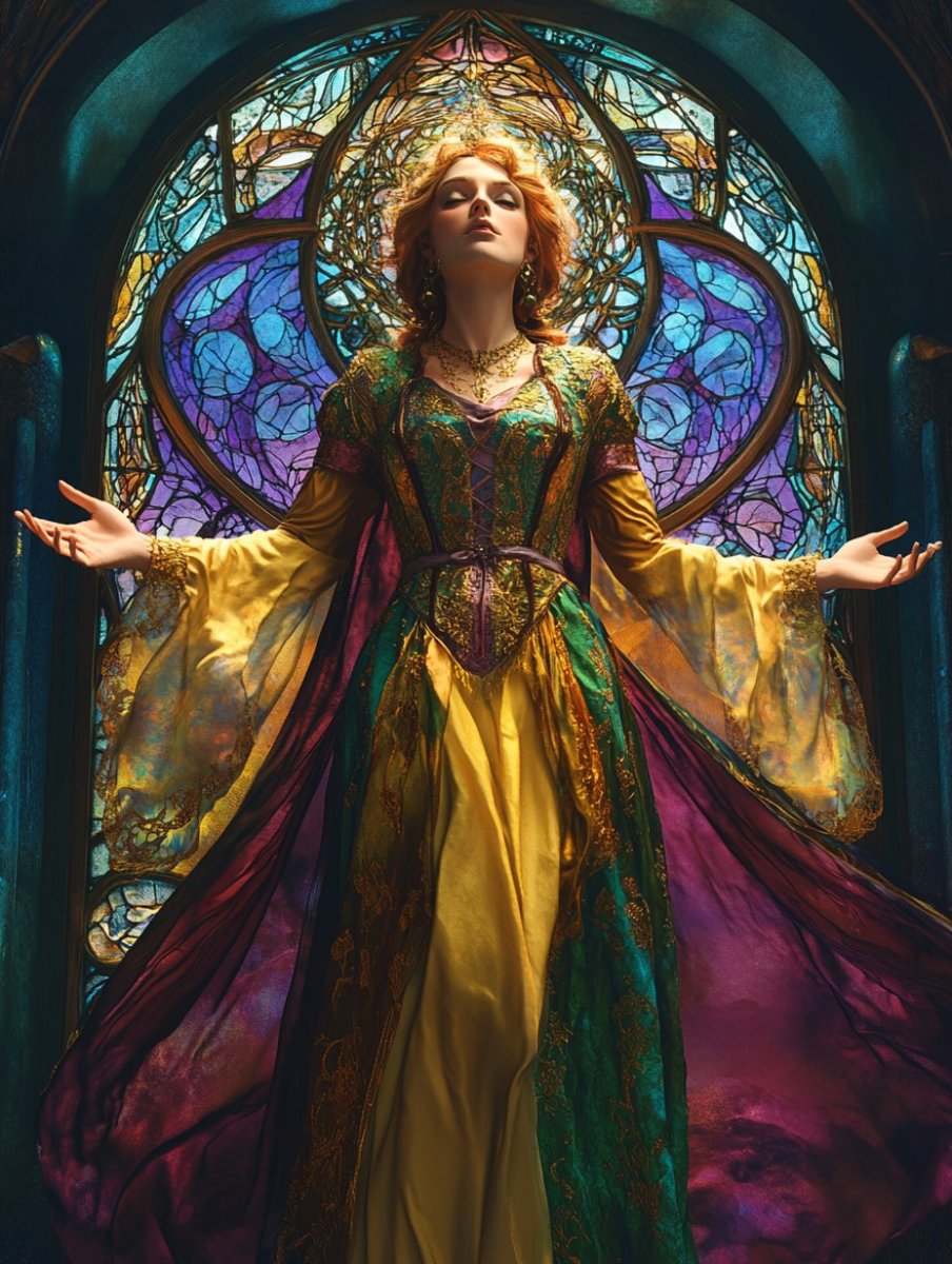 Завораживающее видение неземной красоты, сотканное в стиле ар-нуво с отсылками к творчеству Грега Рутковски и Альфонса Мухи. Изображение поражает обилием деталей: развевающиеся одежды напоминают туманную дымку, а меланхоличное выражение лица передает глубокую эмоциональную насыщенность. Мягкий золотой свет создает драматический эффект, играя тенями и подчеркивая кинематографичность композиции. Изображение выполнено с использованием Octane Render в разрешении 8k, что обеспечивает невероятную четкость и реалистичность текстур кожи. Мастерская работа, выполненная с применением техник профессиональной фотографии на камеру Canon EOS 5D Mark IV при апертуре f/2.8 для достижения максимальной точности фокусировки и глубины резкости. Это не просто изображение – это погружение в мир грез, где красота и печаль переплетаются воедино, создавая неповторимую атмосферу таинственности и утонченности. Каждый элемент картины проработан с любовью и вниманием к деталям, от изящных линий одежды до мельчайших нюансов освещения. Это произведение искусства способно вызвать сильные эмоции и оставить неизгладимое впечатление в душе зрителя