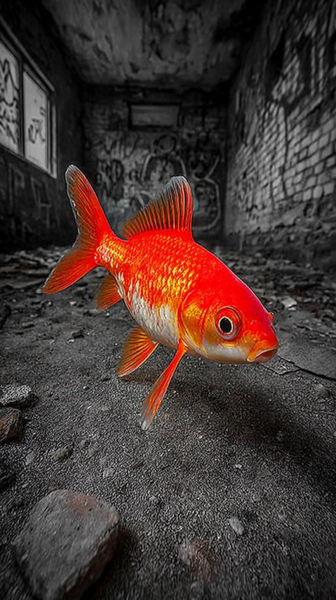 midjourney Золотая рыбка в каменных джунглях: причудливое сочетание природы и города. Картинка из нейронной сети Midjourney