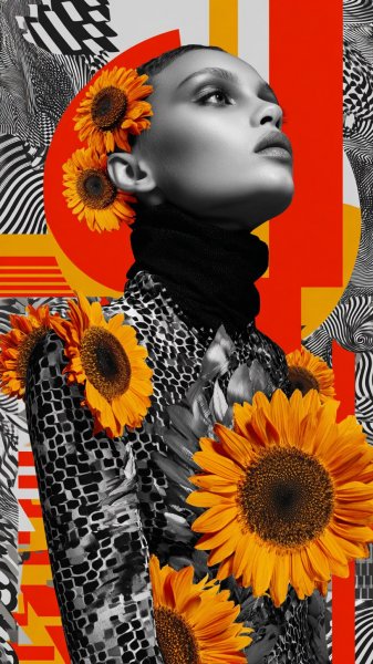 Яркий контраст оранжевых и черных полос формирует завораживающий узор на лице женщины, подчеркнутый роскошным золотым блеском, играющим в свете на фоне темного сюрреалистичного пространства. Это визуальное произведение искусства излучает смелость и современность, словно воплощая дух авангардной эстетики. Композиция создает ощущение динамики и загадочности, где геометрия полос встречается с мерцанием золота, а темный фон усиливает драматизм образа. Использование насыщенных цветов и необычной текстуры блеска привлекает внимание и вызывает сильные эмоции, подчеркивая индивидуальность и неповторимость. Вся картина пронизана ощущением силы и уверенности в себе, что делает ее особенно запоминающейся и эффектной. Это не просто изображение, а визуальная метафора, отражающая современное понимание красоты и искусства. Игра света и тени, сочетание противоположностей – всего этого помогает создать глубокое впечатление и заставляет зрителя задуматься о скрытых смыслах и значениях. Восхитительное сочетание графики и гламура создает поистине уникальный визуальный опыт