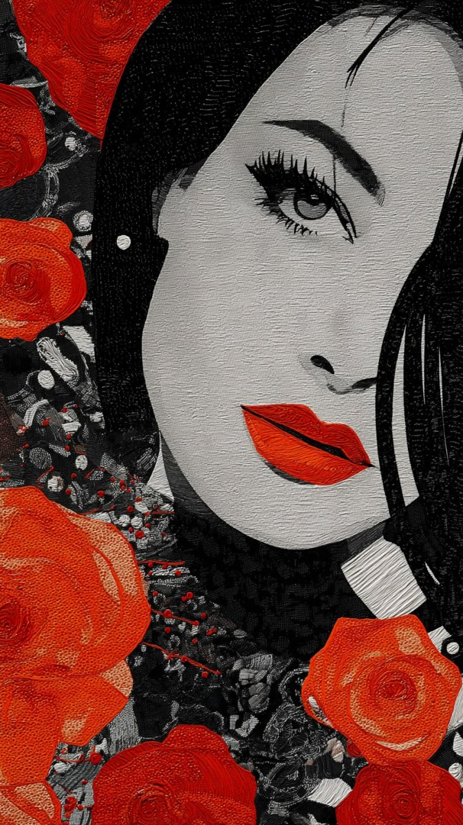 Изысканный портрет в стиле ар-деко запечатлевает пленительную красоту привлекательной женщины с длинными черными волосами и яркой красной помадой. Искусство Жана вдохновляет на создание этого произведения, где контраст черно-белой полосатой ткани, украшенной алыми розами, подчеркивает роскошь и чувственность образа. Прекрасные черты лица, выразительные губы и соблазнительные ресницы создают неповторимый шарм. Тщательно продуманный дизайн, яркий оранжевый оттенок, неоновый блеск и интенсивное освещение придают портрету завораживающую динамику и современность. Этот стиль излучает богатство и утонченность, а эффектная поза с подхваченной рукой добавляет образу загадочности и элегантности. Портрет – это ода женственности и стилю, воплощенная в ярких красках и смелых решениях, дарящая зрителю ощущение роскоши и неповторимого очарования эпохи ар-деко. Каждое детали продумана до мелочей, создавая визуальный шедевр, который не оставляет равнодушным. Это произведение искусства – гимн красоте, уверенности и безупречному вкусу