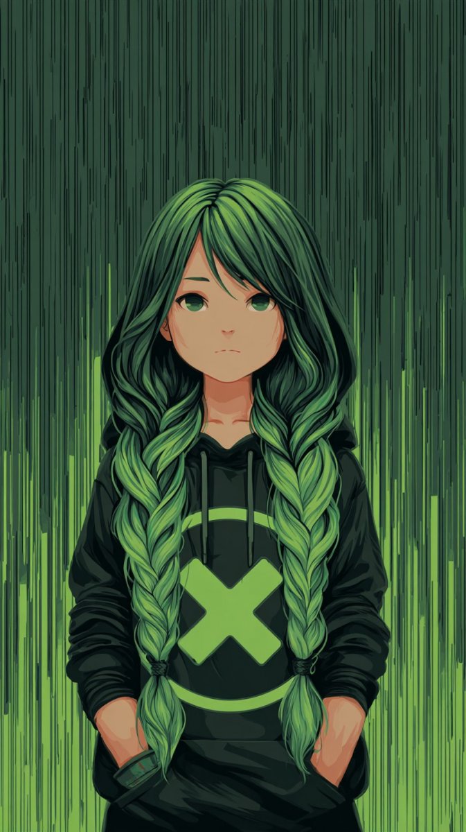 mermaid core, a minimalistic black and green background with a smiley face symbol, crossed eyes, and fangs, neon-colored dice, simple design, lively atmosphere, fashion design, urban explorer girl, creative vibe, avant-garde girl, free-spirited vibe, fusion aesthetic girl –s 750 --style raw