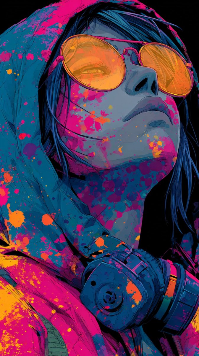 cyber girl surrounded by vibrant splashes of paint, the hood adorned with bright colors, adding to its eye-catching appension, dark academia, black background, colorful fill, vector illustration, hyperrealistic details, dreamy and intricate style, inspired vibe, edgy girl –s 750 --style raw
