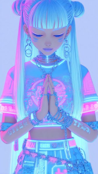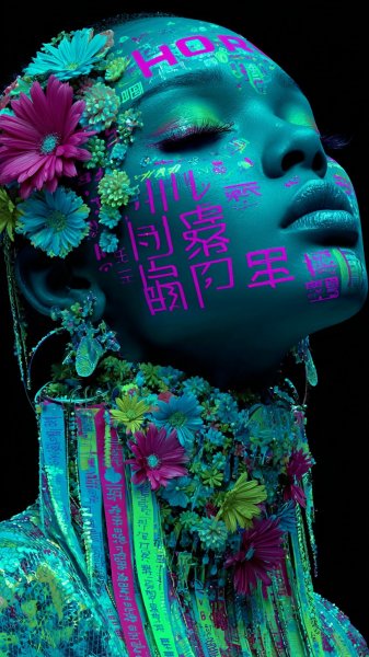 Яркая и дерзкая иллюстрация в стиле аниме демонстрирует девушку с неоновым макияжем, органично вплетенным в абстрактные композиции из светящихся линий. Визуальный ряд пронизан эстетикой глитча – цифровыми помехами и искажениями, которые добавляют динамики и футуристичности изображению. Неоновая фотография создает ощущение мигающего света и энергии, а контраст между насыщенными цветами и глубоким черным фоном подчеркивает выразительность и драматизм сцены. Изображение захватывает взгляд своей интенсивностью и необычным сочетанием стилей – от мягких линий аниме до резких форм глитч-арта. Каждое пятно неонового свечения, каждый цифровой артефакт работают на создание уникальной атмосферы бунтарства и технологической продвинутости. Это визуальное воплощение энергии молодости, смелости и любви к современному искусству. Работа выполнена в высоком разрешении s 750 с использованием стиля raw, что обеспечивает максимальную детализацию и передачу текстур. Изображение идеально подойдет для оформления цифровых медиа, создания ярких обоев или использования в качестве вдохновения для творческих проектов. Контрастные цвета и динамичный дизайн делают эту работу запоминающейся и привлекающей внимание. Вся композиция излучает пульсирующую энергию, словно захватывая момент мгновенной вспышки света в цифровом пространстве