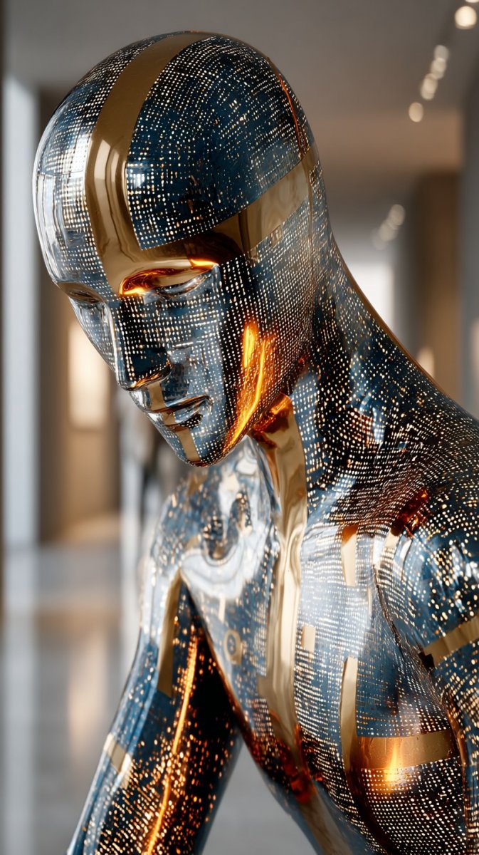 Загадочная абстрактная скульптура, сотканная из замысловатых металлических узоров, погружена в мягкие тени и освещена прохладным светом. Её гладкая поверхность отражает современную эстетику окружающего пространства галереи, а детализированные текстуры создают ощущение невероятной реалистичности, вовлекая зрителя в тактильное восприятие формы. Уникальная конструкция бросает вызов привычным представлениям о пространстве и объёме, гармонично взаимодействуя с выверенной композицией и чёткими линиями галереи. Это не просто предмет искусства – это визуальный парадокс, сочетающий в себе холодную строгость металла и живую динамику абстрактных форм. Скульптура словно застывшее движение, приглашающее к размышлениям о природе красоты, сложности и взаимосвязи между искусством и окружающей средой. Она выступает как мощный акцент в интерьере галереи, притягивая взгляды и вызывая желание приблизиться, чтобы рассмотреть каждую деталь, каждый изгиб, каждое отражение света. Скульптура – это воплощение интеллектуальной глубины и визуального великолепия, способное вдохновить на новые открытия и переосмысление привычных понятий. Это произведение искусства, которое оставляет неизгладимое впечатление в памяти каждого зрителя