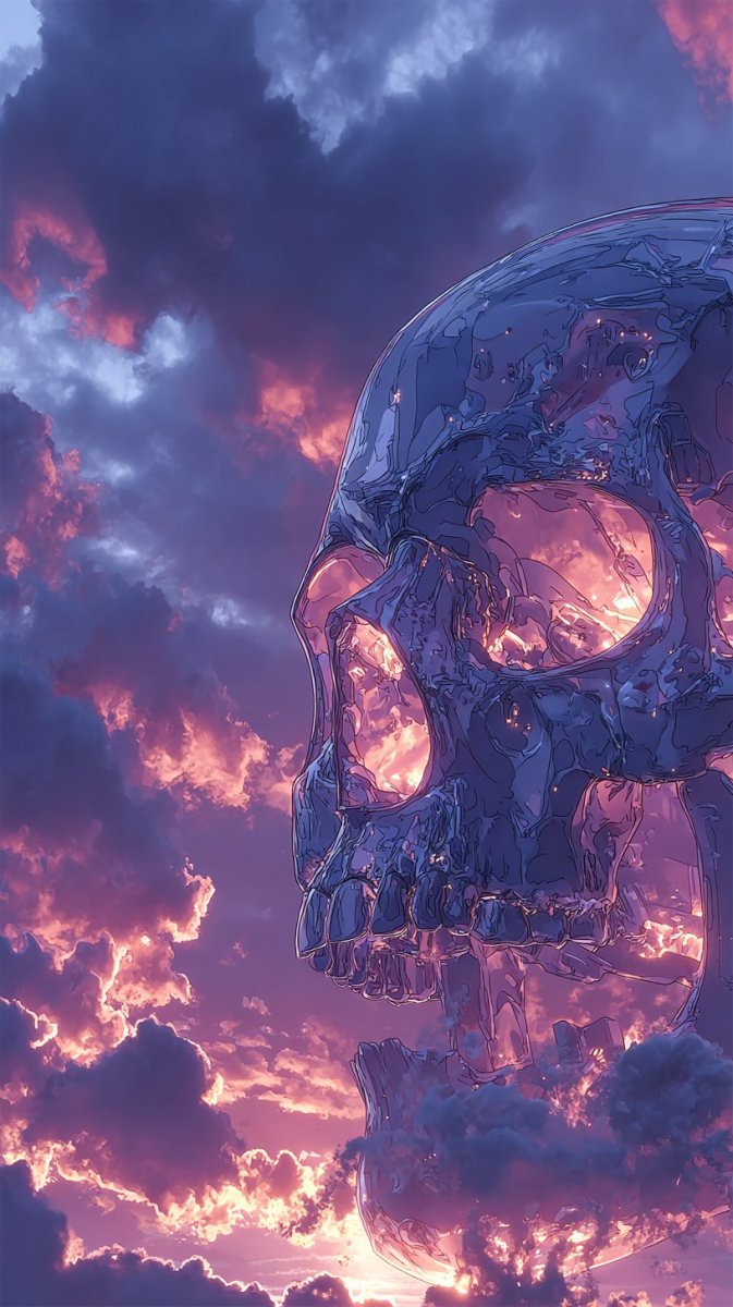 Неоновый череп: сюрреалистичный портрет в драматическом небе - Пример генерации нейросети Midjourney