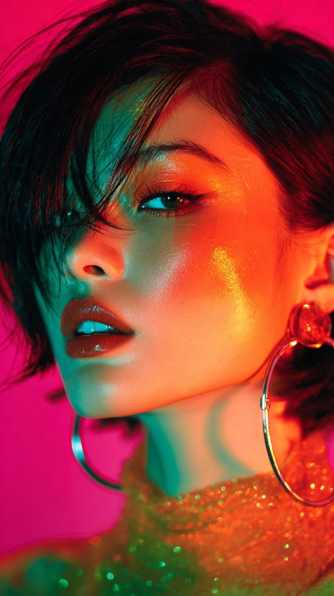 Яркий портрет женщины, воплощающий смелость и страсть, с необыкновенным макияжем в оранжевых и неоново-клубничных геометрических формах. Выражение лица модели – это заявление, полный уверенности и энергии, а взгляд пронзителен и притягивает внимание зрителя. Задний план взрывается яркими красками: флуоресцентным розовым и насыщенно-бирюзовым, создавая электрическую атмосферу, идеально подходящую для глянцевых модных журналов и креативных фотосессий. Этот образ – манифест современной красоты, где геометрия встречается с эмоциями, а смелые цвета подчеркивают индивидуальность и неповторимость. Портрет излучает динамику и инновационный подход к моде, демонстрируя силу визуального языка и его способность передавать сложные чувства и настроения. Это не просто фотография, а произведение искусства, которое вдохновляет на эксперименты и поиск новых форм самовыражения в мире моды и красоты. Композиция тщательно продумана для максимального воздействия на зрителя, создавая эффект полного погружения в яркий и запоминающийся мир современной эстетики. Использование неоновых оттенков добавляет портрету футуристичности и подчеркивает его современность