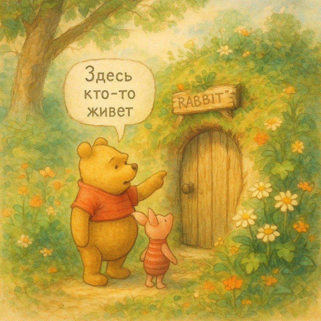 На иллюстрации Винни-Пух и Пятачок стоят перед уютным домиком Кролика, окруженным пышной зеленью и яркими цветами. Винни-Пух с любопытством указывает на деревянную дверь и говорит: "Здесь кто-то живет". Мягкая, теплая атмосфера дневного света, причудливый и ностальгический стиль, напоминающий классические иллюстрации из детских книг, акварельные текстуры, нежные пастельные тона.