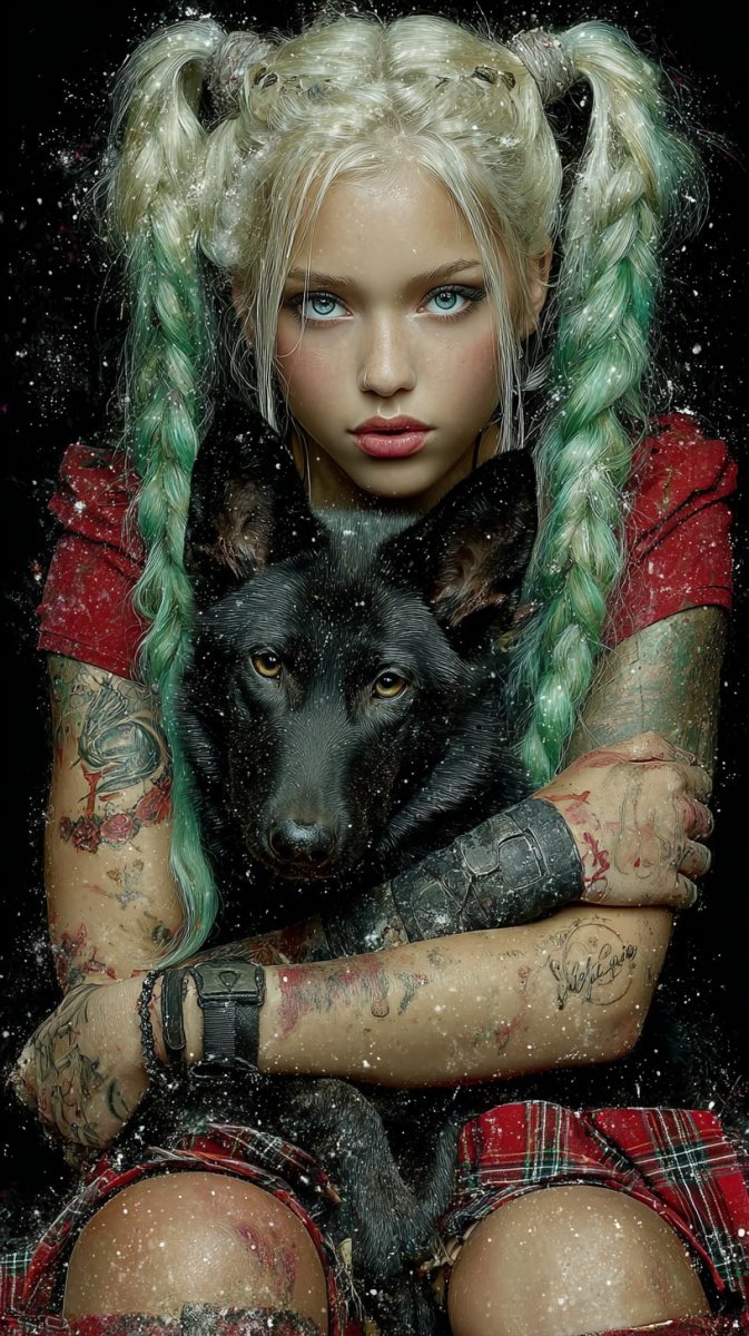 Мрачная и дерзкая героиня в стиле готик-панк предстает перед нами в завораживающем цифровом портрете. Ее длинные косички, переливающиеся неоново-зеленым и белым цветами, контрастируют с красной клетчатой юбкой, создавая эффектный акцент. В руках она нежно держит черного волка – верного спутника и символа ее силы. Фон погружен в густую тьму, усыпанную космической звездной пылью, добавляя изображению таинственности и мистики. На коже видны четкие контуры эджей-татуировок, свидетельствующих о бунтарском характере персонажа. Выразительные большие глаза полны эмоций и загадочности, притягивая взгляд зрителя. Яркая палитра цветов в сочетании с высокой детализацией подчеркивают мастерство цифрового художника. Картина излучает энергию и дерзость, отражая дух готик-панк культуры. Это не просто портрет – это целая история, рассказанная языком цвета, света и тени. Мощный образ сильной и независимой женщины, окруженной миром фантазий и тайн, никого не оставит равнодушным. Использование передовых технологий позволяет передать мельчайшие детали, делая изображение невероятно реалистичным и живым. Эта работа – пример того, как цифровое искусство может создавать поистине незабываемые визуальные впечатления