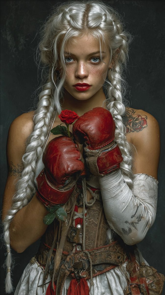 fierce female MMA fighter with long white braided hair, red lips with a rose, hyperrealistic, chromatic aberration, whimsical elements, --s 750 --style raw --w 10