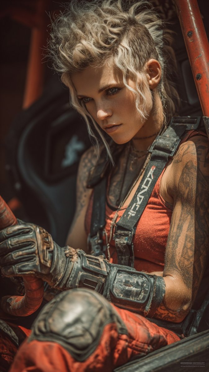 a blonde girl with a mohawk dominating the octagon with powerful moves, skillfully driving a racing car on the track, displaying her skills as an elite martial artist, adrenaline-fueled action, high energy --s 750 --style raw --w 10