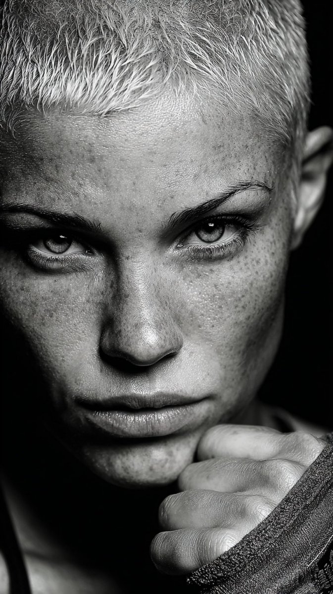Мощная и уверенная в себе блондинка с короткой стрижкой доминирует на ринге смешанных единоборств демонстрируя невероятную силу и ловкость настоящего чемпиона. Каждый ее удар, каждое движение пропитаны решимостью и мастерством. Фотореалистичное изображение захватывает каждую деталь ее мускулистого тела и сосредоточенного взгляда, выделяя атлетизм и выносливость спортсменки на фоне драматичного темного пространства. Освещение акцентирует внимание на каждом изгибе мышц, подчеркивая ее физическую подготовку и непоколебимую волю к победе. Этот портрет – это не просто изображение бойца; это символ силы духа и преданности своему делу. Изображение создано с использованием Canon EOS R5 и объектива 50mm f/1.8, что обеспечивает исключительную детализацию и глубину резкости, делая каждую черту лица и каждый мускул отчетливым и реалистичным. Стиль raw позволяет сохранить максимальную естественность цветов и текстур, передавая атмосферу напряженной борьбы и адреналина на ринге. Это визуальное воплощение атлетизма, силы и непоколебимой воли к победе, запечатленное в мельчайших деталях благодаря передовым технологиям съемки и художественному видению автора. Фотография передает динамику боя и внутреннюю силу спортсменки, вызывая восхищение ее мастерством и решимостью
