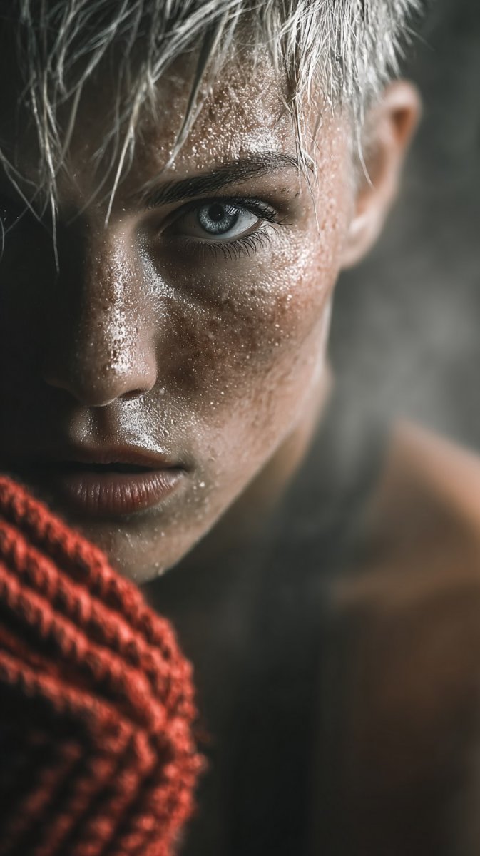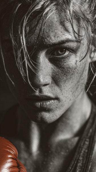 Мощный кадр демонстрирует дерзкую блондинку с ирокезом, полностью погруженную в яростную схватку на ринге. Взмах ее кулака направлен точно в противника, излучая уверенность и невероятную силу. Выражение лица решительное, сосредоточенное, подчёркнутое драматическим освещением, которое акцентирует каждую черту и передает всю гамму эмоций. Загадочный фон из клубящегося дыма добавляет сцене напряженности и глубины, усиливая ощущение динамики и интенсивности момента. Фотография выполнена в потрясающей фотореалистичной детализации, позволяя ощутить всю грубую мощь бокса – каждый пот, каждую мышцу, каждое движение. Использование профессионального оборудования Sony A7R IV с объективом FE 24-70mm f/2.8 GM позволило запечатлеть этот невероятный момент с максимальной четкостью и реалистичностью, создавая эффект присутствия и полного погружения в атмосферу спортивного поединка. Это не просто фотография – это застывший во времени фрагмент борьбы, олицетворяющий дух соперничества и стремление к победе. Она передаёт ощущение энергии, адреналина и непоколебимой воли к победе, делая ее поистине захватывающим зрелищем