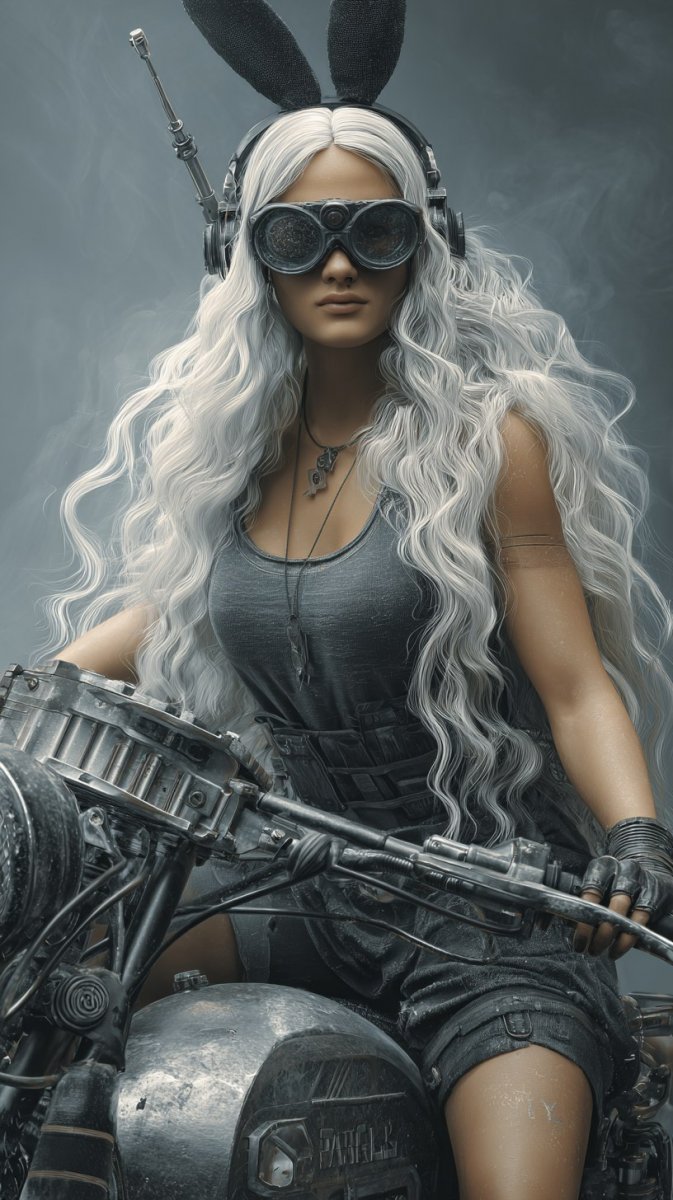 Завораживающий портрет девушки-байкера в футуристическом сеттинге. Она восседает на черном мотоцикле с серебряными металлическими деталями, окруженная клубами тумана и хаотичным переплетением проводов – словно попала в киберпанковскую реальность. Длинные распущенные белые волосы контрастируют с дерзким образом: большие черные заячьи уши и защитные очки придают ей некую игривую, но одновременно загадочную ауру. Девушка одета в серый вязаный свитер и короткие черные шорты, что подчеркивает ее силуэт и создает ощущение свободы. Ее серьезный взгляд, направленный прямо в камеру, говорит о сильном характере и уверенности в себе. Особое внимание привлекают футуристические наушники с рогами и антенной – элемент, дополняющий образ и усиливающий ощущение технологичности происходящего. Изображение выполнено в технике цифрового искусства в стиле raw, что добавляет ему особую остроту и необузданность. Картина пронизана атмосферой тайны и напряжения, а использование темных тонов создает эффект драматизма и подчеркивает индивидуальность модели. Это не просто портрет – это визуальный манифест бунтарского духа и смелого самовыражения в мире будущего. Насыщенная детализация и необычный выбор аксессуаров делают эту работу поистине уникальной и запоминающейся, приглашая зрителя окунуться в мир фантазий и киберпанка