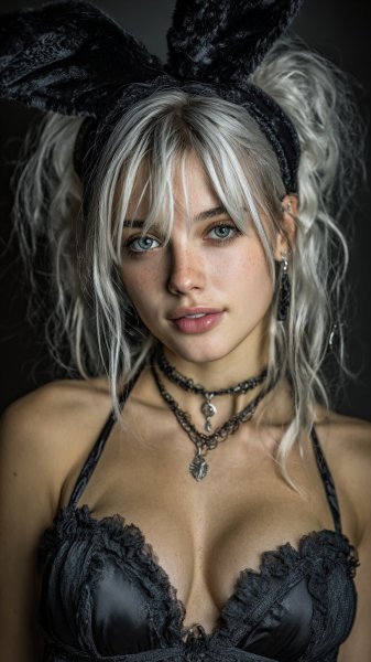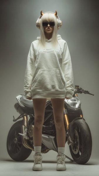 Завораживающий цифровой портрет молодой женщины, олицетворяющий собой силу и футуристическую элегантность. Ее серьезное выражение лица контрастирует с игривыми пушистыми черными заячьими ушками, создавая неожиданный и запоминающийся образ. Длинные белоснежные волосы плавно ниспадают на плечи, подчеркивая ее безупречный стиль. Одета она в серебристые шорты и серый свитер, дополненные стильными черными наушниками с серебряными деталями – символом современных технологий и связи. Запечатленная на фоне темного дымчатого пейзажа, она величественно восседает на гладком черном мотоцикле с изящными серебряными акцентами. Мотоцикл добавляет динамики и намекает на свободу передвижения и приключений. Вся композиция пронизана футуристической атмосферой и дерзким настроением, создавая ощущение энергии и уверенности в себе. Использование стиля raw подчеркивает необработанность и аутентичность изображения, а параметры S 750 и w 10 указывают на высокую детализацию и четкость линий. Эта работа – визуальное воплощение современной моды, передовых технологий и сильного женского характера, сочетающее в себе нежность и решительность. Изображение вызывает ощущение загадки и побуждает задуматься о будущем, где встречаются реальность и фантазия. Это произведение искусства станет прекрасным украшением для любого пространства, излучая современный стиль и утонченность